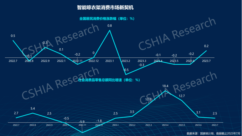 从智能晾衣架消费市场数据来看,根据国家统计局发布数据获取,从2022上半年到2023年上半年,全国居民消费价格、城市及农村人均收入继续提升,这表明国内消费市场正在逐步复苏。同时社会消费品零售总额也依然处于稳定的增长期,市场复苏迹象愈发明显,而且人均主要消费支出在于食品及住房,这表明消费人群较为关注家庭相关的支出,由此得知,C端消费者市场潜力较大。