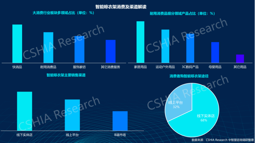 根据CSHIA Research中智盟调研整理发现,在整个大消费领域中,耐用品消费成为主流之一,仅次于用户日常生活的快消品,而在耐用消费品中,家居用户占据主要,而且耐用消费品的稳健发展主要来源是个人清洁工具在居家场景中存在感较高,比如说智能晾衣架等产品。