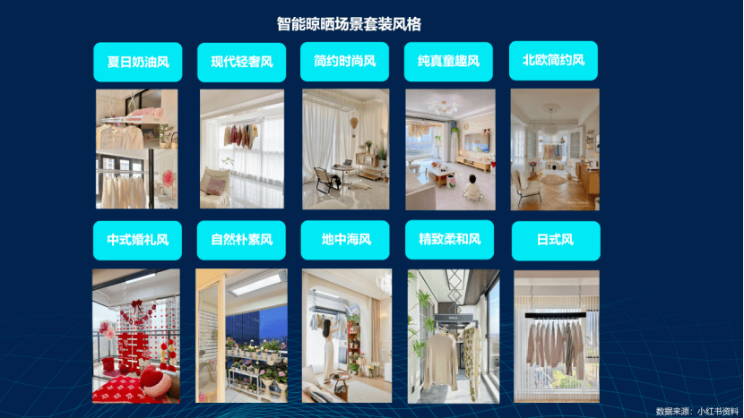 CSHIA Research中智盟调研也针对不同的家装风格,特别从中优选了不同的智能晾晒套装风格,用户可根据自己的喜好,选择不同的智能晾晒场景套装风格,主要有夏日奶油风、现代轻奢风、简约时尚风、纯真童趣风、北欧简约风、中式婚礼风、自然朴素风、地中海风、精致柔和风、日式风等装修风格,可以满足不同的家装空间,隐形智能晾衣机大大提升了家庭环境的完美融入感。