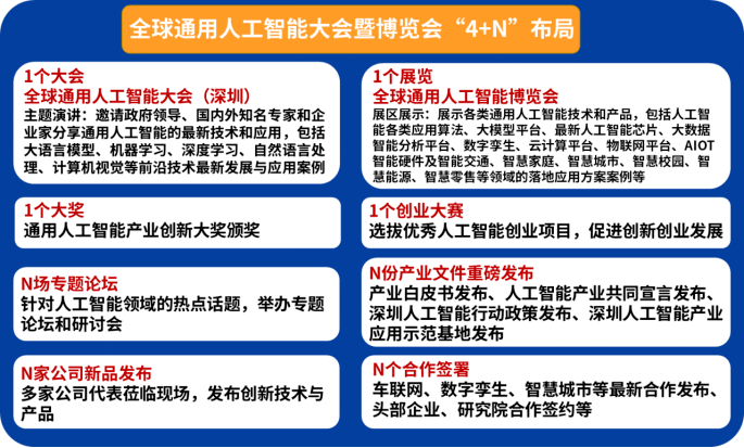 但是,必须要强调的是,上文仅提到了1个展区+1个大会+N场论坛,而这对深圳市人工智能产业协会带来的“4+N”主题来说,仅仅是其中一部分,下图则是“4+N”的全布局: