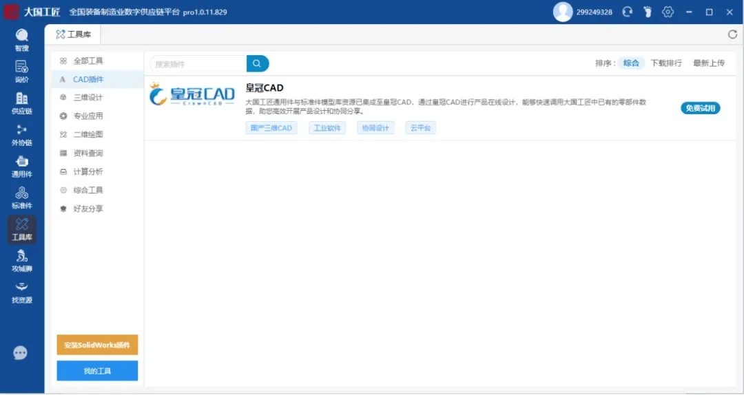 登录大国工匠,选择“CAD插件”,选择“免费试用”,即可直接进入皇冠CAD。该入口已经免费开通专业版,您可以畅通无阻地使用皇冠CAD的全部功能。