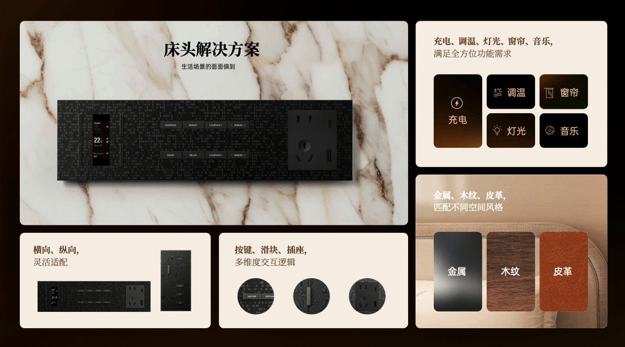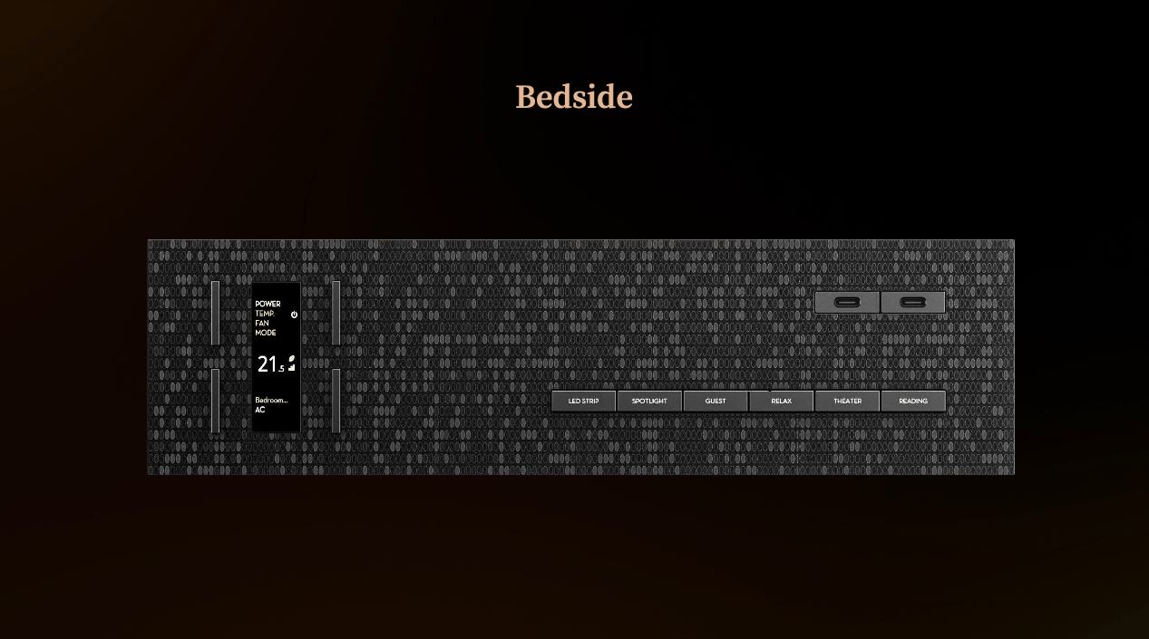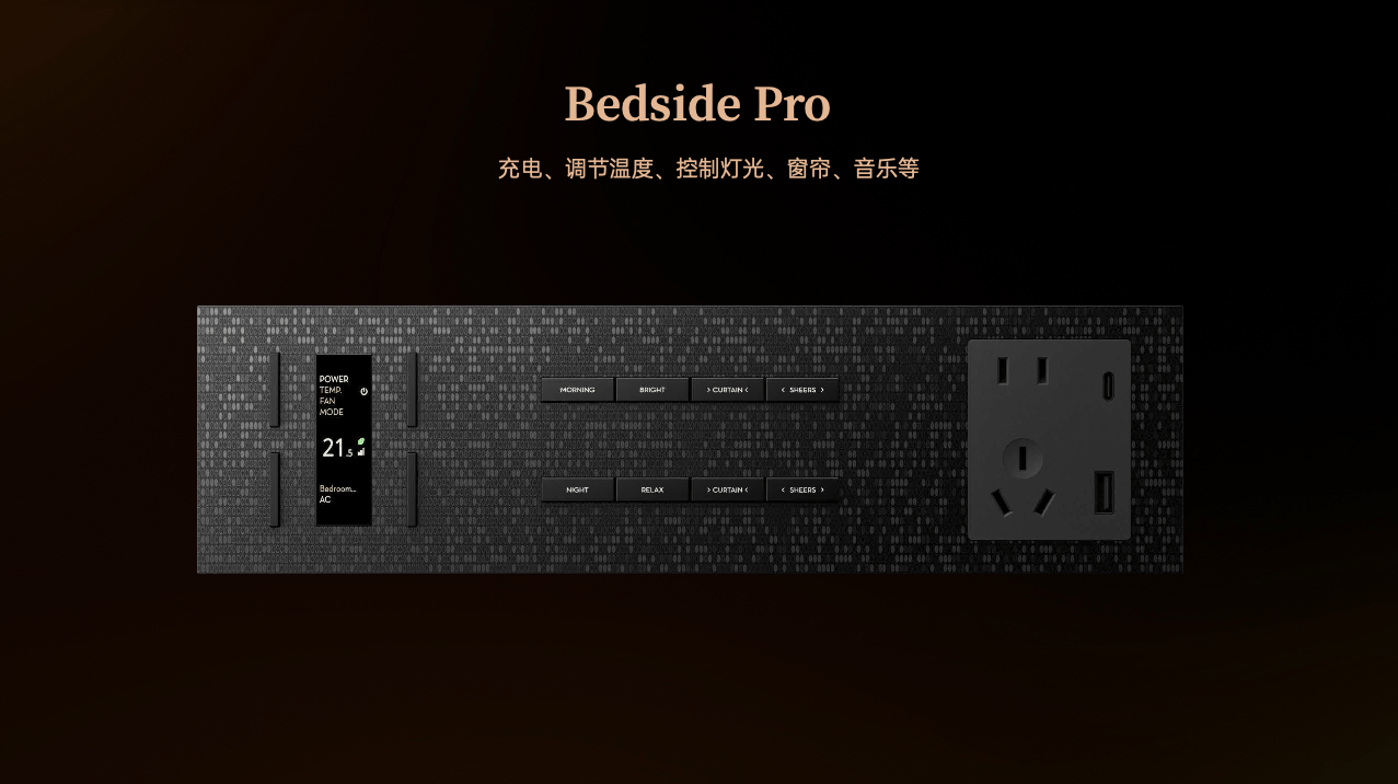 The Bedside Pro是一款尽可能保留用户原有使用习惯的全尺寸床头组合面板。以完整的功能体系,融合插座、按键与温控模块,让充电、控光、调温与音律切换在一体之间自然衔接。