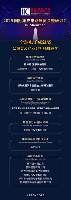 以下是由AspenCore全球资深产业分析师组成的评审委员会以及来自亚、美、欧洲的网站用户群共同评选出的获奖者。2025年度获奖名单如下: